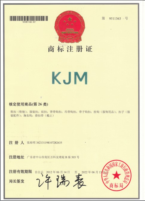 中山市吉美手袋配件有限公司的注册商标为“KJM”字样以及公司图案logo,核定服务项目为第26类,鞋扣(鞋链);服装扣;纽扣;背带勾扣;吊带勾扣;带子勾扣;挂钩(服饰用品);扣子(服装配件);胸衣钩;搭扣带(截止)。中山市吉美手袋配件有限公司在国家允许的服务项目范围内拥有商标的专用权,凡经营与吉美扣具相同服务项目的其他单位和个人使用相同或相近的商标将构成侵犯我公司商标专用权的行为,我公司可以依法要求其停止侵害,并有权要求其赔偿损失我公司KJM商标,