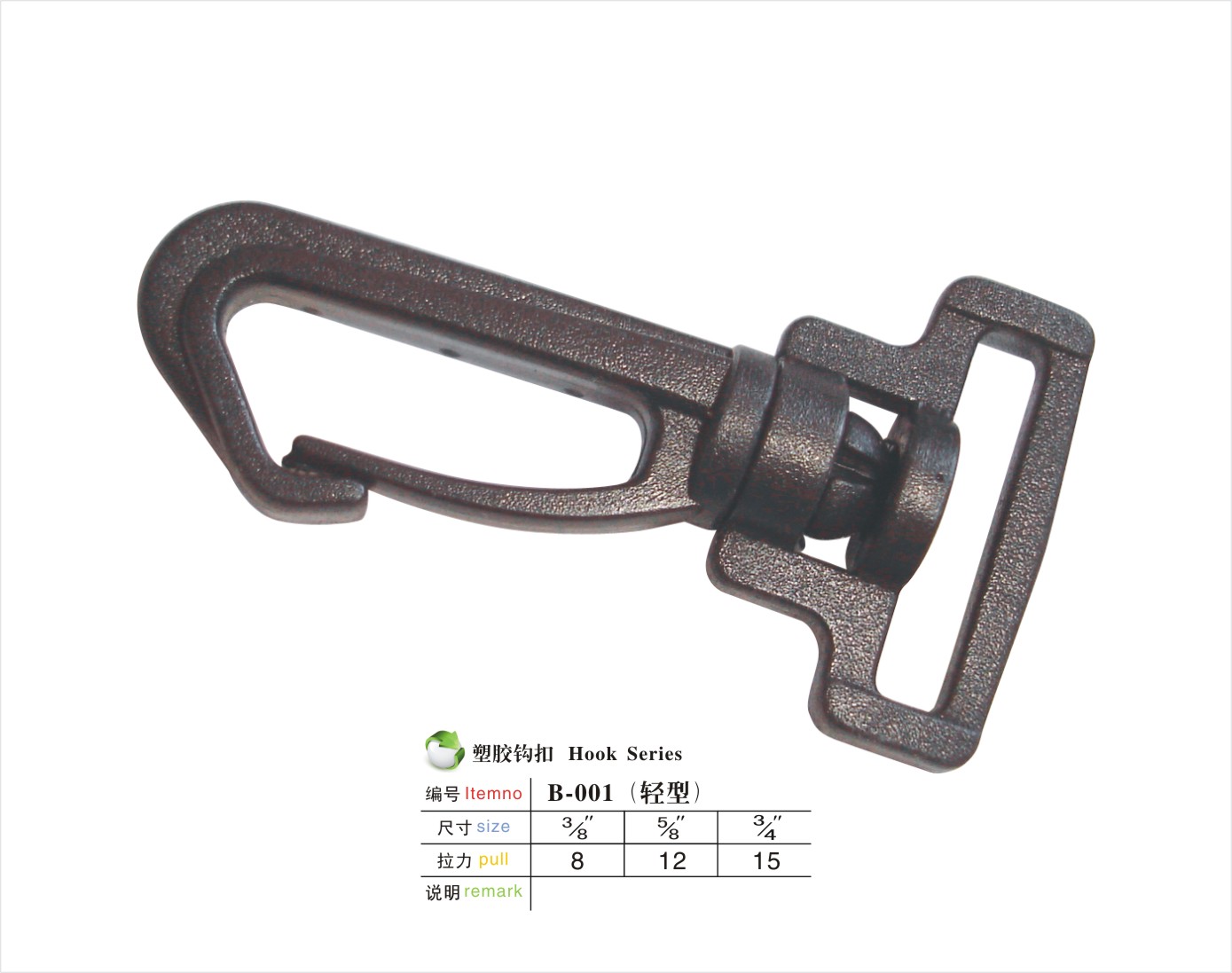 编号:B-001轻型规格:3/8" 5/8" 3/4" 材质:POM/PA说明:该款扣具操作方便,耐用结实.适用于相机包,电脑包等背包。申明:我公司所生产的产品主要间接面对国外市场。所有产品可通过欧美最低测试标准EN71-3(8大重金属测试)。当然,我们也可根据客户的要求,生产符合国际标准的ROHS测试以及最新的邻苯二钾酸盐REACH测试的标准。