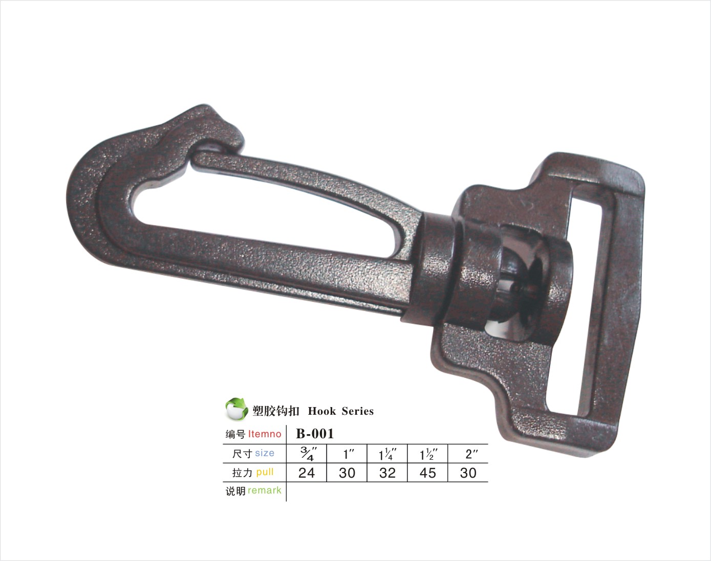 编号:B-001规格: 3/4" 1" 1-1/4" 1-1/2" 2" 材质:POM/PA说明:该款扣具操作方便,耐用结实.适用于相机包,电脑包等背包。申明:我公司所生产的产品主要间接面对国外市场。所有产品可通过欧美最低测试标准EN71-3(8大重金属测试)。当然,我们也可根据客户的要求,生产符合国际标准的ROHS测试以及最新的邻苯二钾酸盐REACH测试的标准。