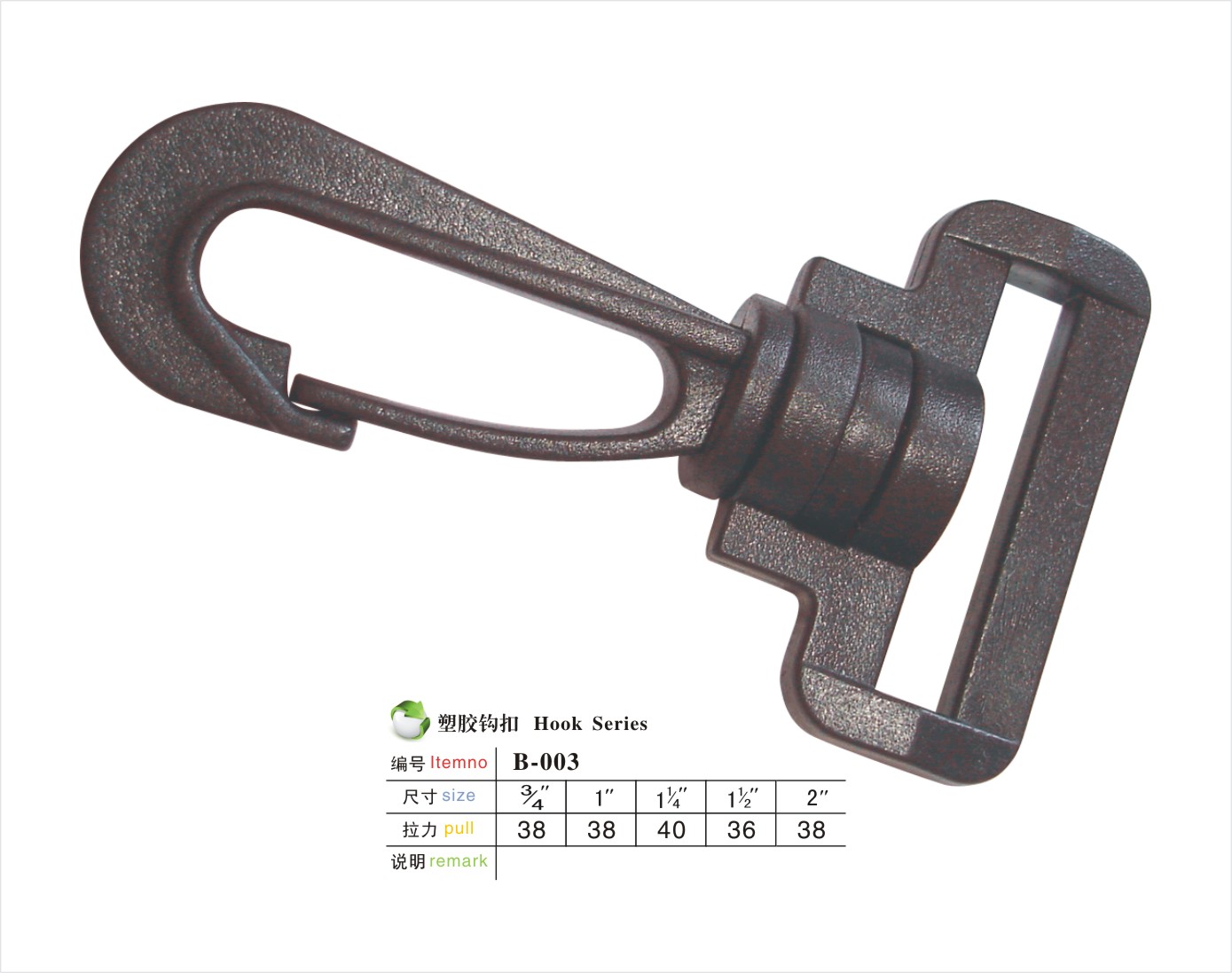 编号:B-003规格:3/8" 1/2" 5/8" 3/4" 1" 1-1/4" 1-1/2" 2" 材质:POM/PA说明:该款扣具操作方便,耐用结实.适用于相机包,电脑包等背包。申明:我公司所生产的产品主要间接面对国外市场。所有产品可通过欧美最低测试标准EN71-3(8大重金属测试)。当然,我们也可根据客户的要求,生产符合国际标准的ROHS测试以及最新的邻苯二钾酸盐REACH测试的标准。