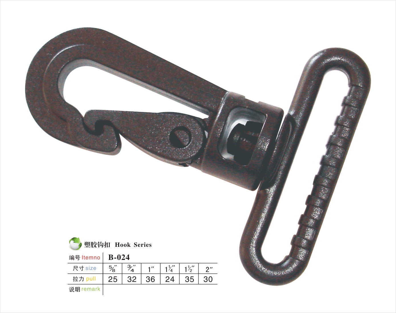 编号:B-024规格:5/8" 3/4" 1" 1-1/4" 1-1/2" 2" 材质:POM/PA说明:该款扣具操作方便,耐用结实.适用于相机包,电脑包等背包。申明:我公司所生产的产品主要间接面对国外市场。所有产品可通过欧美最低测试标准EN71-3(8大重金属测试)。当然,我们也可根据客户的要求,生产符合国际标准的ROHS测试以及最新的邻苯二钾酸盐REACH测试的标准。