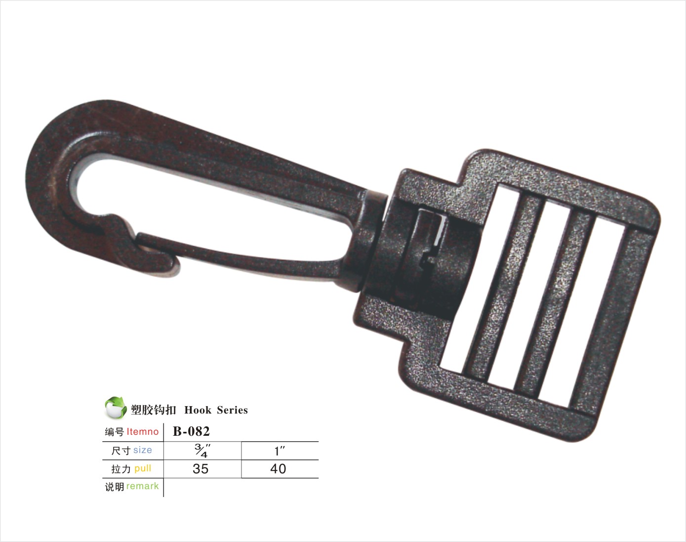 编号:B-082规格:3/4" 1" 材质:POM/PA说明:该款扣具操作方便,耐用结实.适用于各式相机包/电脑包或者婴儿手推车。申明:我公司所生产的产品主要间接面对国外市场。所有产品可通过欧美最低测试标准EN71-3(8大重金属测试)。当然,我们也可根据客户的要求,生产符合国际标准的ROHS测试以及最新的邻苯二钾酸盐REACH测试的标准。