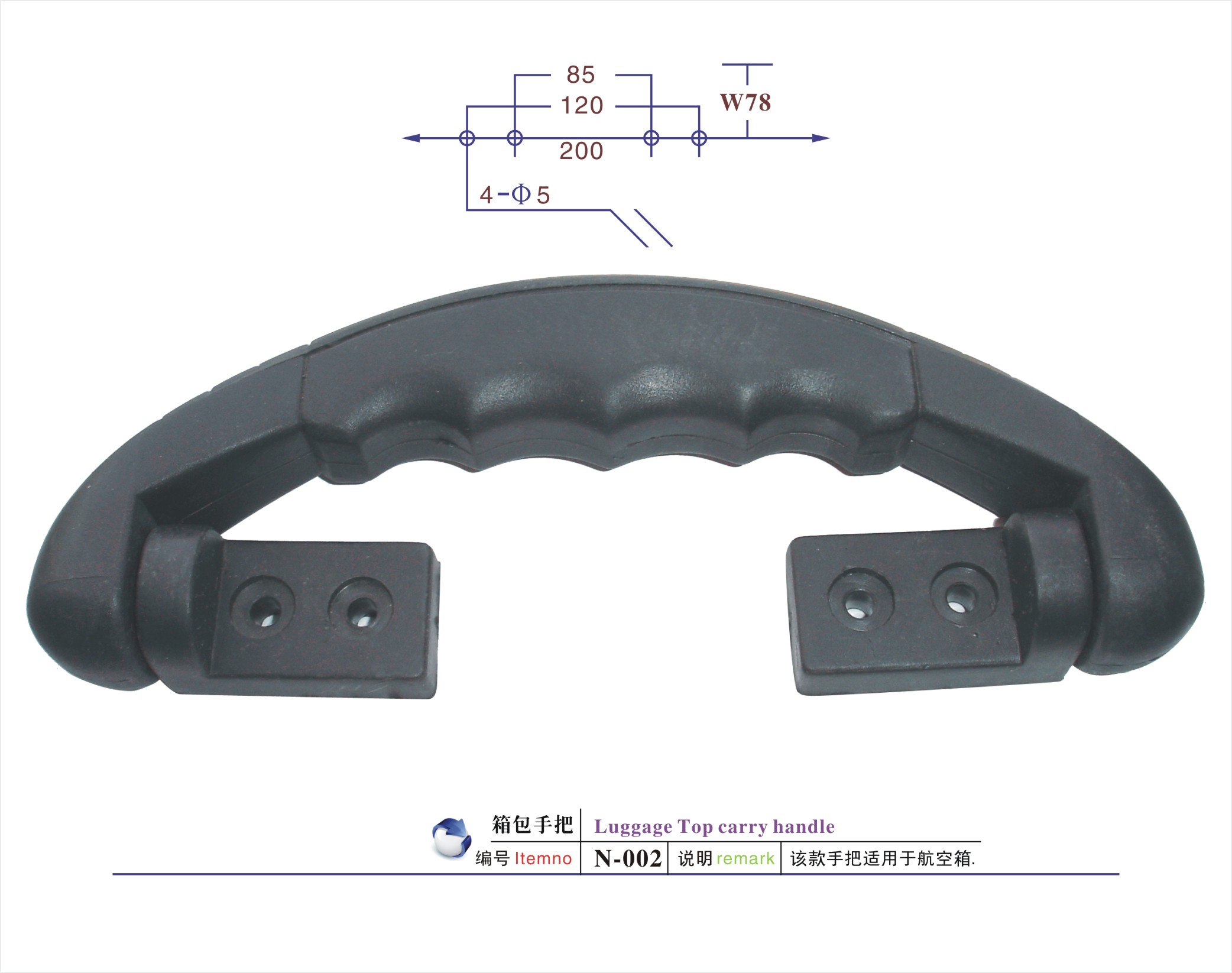 编号:N-002规格:如图材质:PP/POM/PVC/TPR说明:该款手把适用于航空箱/工具箱/铝箱/拉杆箱/行李箱/背包等申明:我公司所生产的产品主要间接面对国外市场。所有产品可通过欧美最低测试标准EN71-3(8大重金属测试)。当然,我们也可根据客户的要求,生产符合国际标准的ROHS测试以及最新的邻苯二钾酸盐REACH测试的标准。
