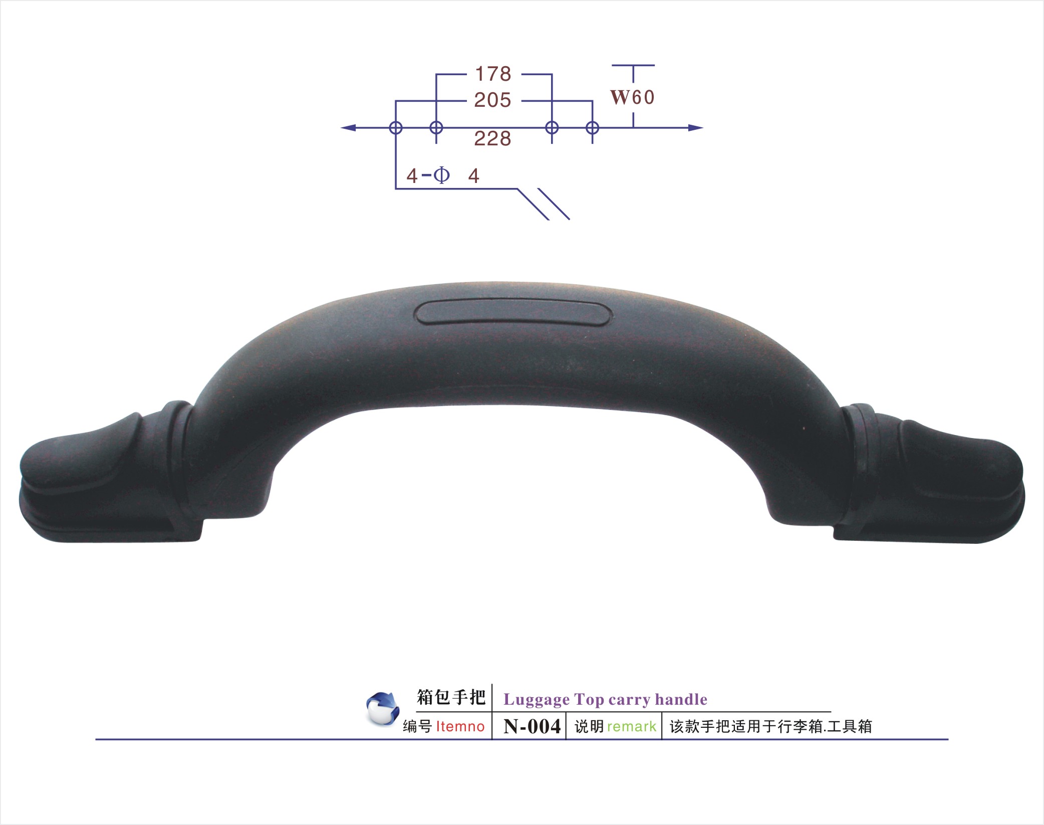 编号:N-004规格:如图材质:PP/POM/PVC/TPR说明:该款手把适用于航空箱/工具箱/铝箱/拉杆箱/行李箱/背包等申明:我公司所生产的产品主要间接面对国外市场。所有产品可通过欧美最低测试标准EN71-3(8大重金属测试)。当然,我们也可根据客户的要求,生产符合国际标准的ROHS测试以及最新的邻苯二钾酸盐REACH测试的标准。