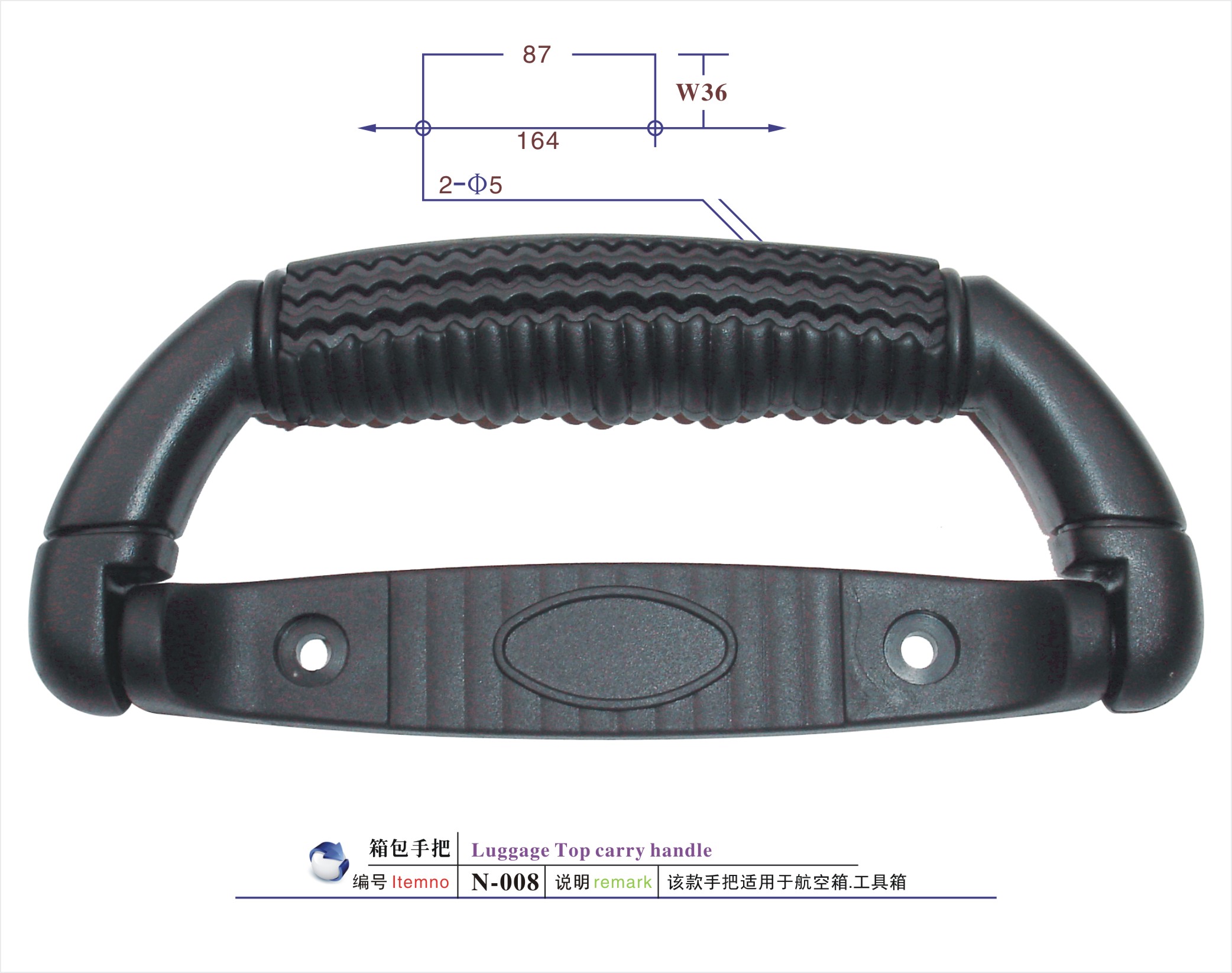 编号:N-008规格:如图材质:PP/POM/PVC/TPR说明:该款手把适用于航空箱/工具箱/铝箱/拉杆箱/行李箱/背包等申明:我公司所生产的产品主要间接面对国外市场。所有产品可通过欧美最低测试标准EN71-3(8大重金属测试)。当然,我们也可根据客户的要求,生产符合国际标准的ROHS测试以及最新的邻苯二钾酸盐REACH测试的标准。