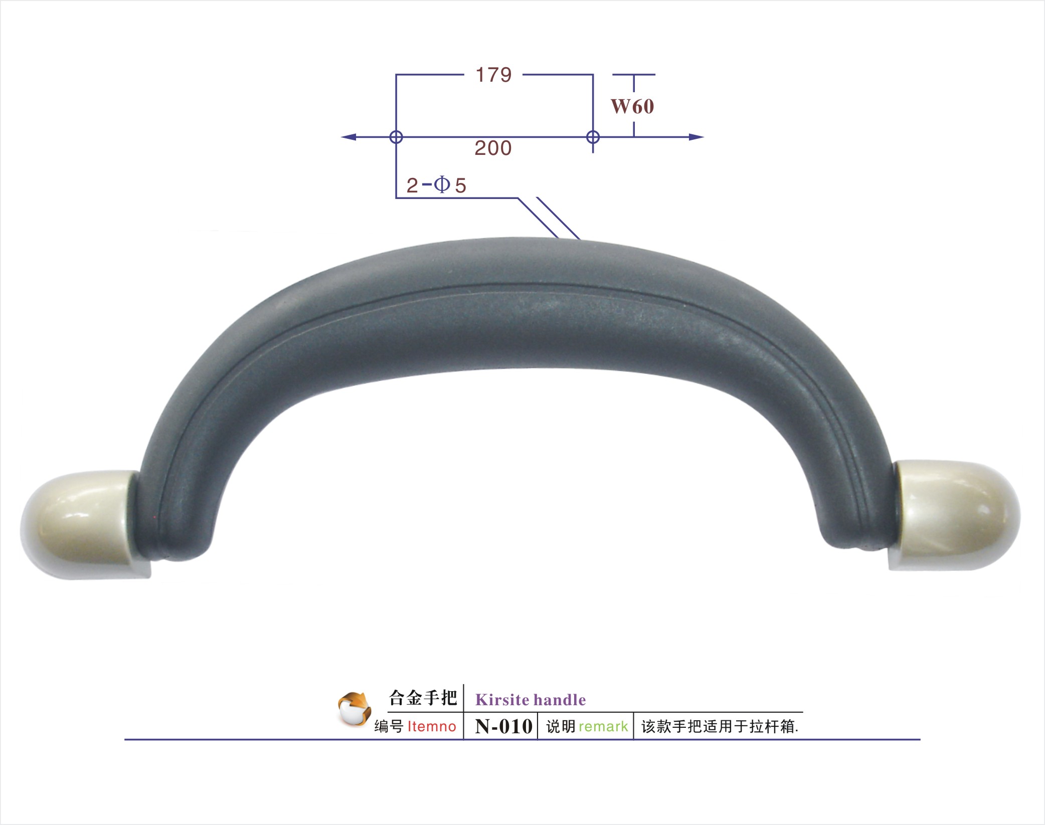 编号:N-010规格:如图材质:PP/POM/PVC/TPR说明:该款手把适用于航空箱/工具箱/铝箱/拉杆箱/行李箱/背包等申明:我公司所生产的产品主要间接面对国外市场。所有产品可通过欧美最低测试标准EN71-3(8大重金属测试)。当然,我们也可根据客户的要求,生产符合国际标准的ROHS测试以及最新的邻苯二钾酸盐REACH测试的标准。
