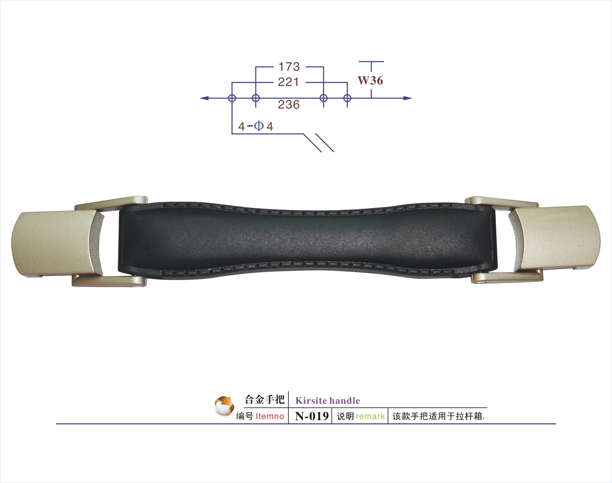 编号:N-019规格:如图材质:PP/POM/PVC/TPR说明:该款手把适用于航空箱/工具箱/铝箱/拉杆箱/行李箱/背包等申明:我公司所生产的产品主要间接面对国外市场。所有产品可通过欧美最低测试标准EN71-3(8大重金属测试)。当然,我们也可根据客户的要求,生产符合国际标准的ROHS测试以及最新的邻苯二钾酸盐REACH测试的标准。
