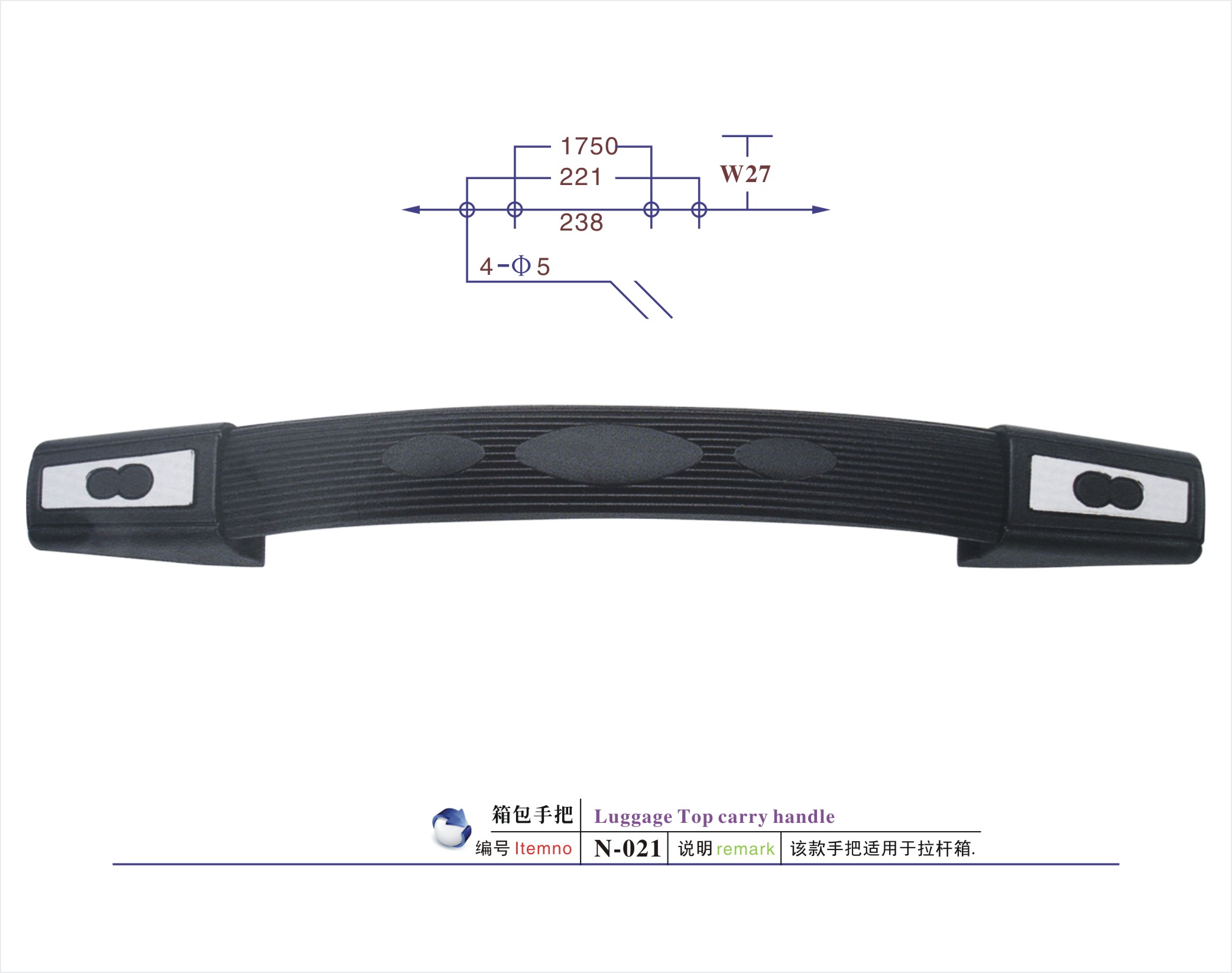 编号:N-021规格:如图材质:PP/POM/PVC/TPR说明:该款手把适用于航空箱/工具箱/铝箱/拉杆箱/行李箱/背包等申明:我公司所生产的产品主要间接面对国外市场。所有产品可通过欧美最低测试标准EN71-3(8大重金属测试)。当然,我们也可根据客户的要求,生产符合国际标准的ROHS测试以及最新的邻苯二钾酸盐REACH测试的标准。